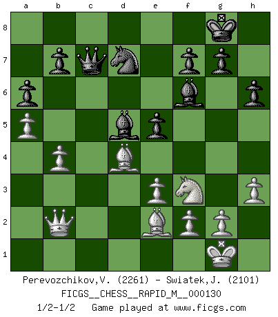 Last move : 1/2-1/2 2022 June 26 6:39:15 [Event "FICGS__CHESS__RAPID_M__000130"] [Site "FICGS"] [Date "2022.05.07"] [Round "1"] [White "Perevozchikov,Vjacheslav"] [Black "Swiatek,Janusz"] [Result "1/2-1/2"] [WhiteElo "2261"] [BlackElo "2101"] 1.d4 d5 2.c4 e6 3.Nf3 Nf6 4.e3 Be7 5.b3 O-O 6.Bb2 c5 7.Bd3 Nc6 8.O-O dxc4 9.Bxc4 cxd4 10.Nxd4 Nxd4 11.Bxd4 Bd7 12.Nd2 Bc6 13.Nf3 Nd7 14.Be2 Qa5 15.Rc1 Rfc8 16.Rc2 Bd5 17.h3 Qd8 18.Qd2 Rxc2 19.Qxc2 Rc8 20.Qb2 Bf6 21.Rc1 Rc7 22.Rxc7 Qxc7 23.b4 h6 24.a4 a6 25.a5 e5 1/2-1/2 Queen's gambit declined Kingside Castling by player Black (move 5) Kingside Castling by player White (move 8) This chess game ended in a draw. Follow this game move after move (download)Chess is a foolish expedient for making idle people believe they are doing something very clever when they are only wasting their time. (George Bernard Shaw) Auf Remis zu spielen ist gewissermaßen ein Verbrechen gegen das Schachspiel. (Mikhail Nekhemyevich Tal) El Ajedrez se juega con la mente... ¡no con las manos!. (Renaud y Kahn) Les réformistes prétendent que les progrès de la théorie conduiront à la disparition des échecs, et qu'il faut, pour leur rendre vie, en remanier les règles. En réalité, qu'exprime cette affirmation? Le mépris de l'intuition, de l'imagination et de tous les autres éléments qui font des échecs un art. (Alexander Alekhine) You must do what you feel is right... of course. (Obi-Wan Kenobi in Star Wars ep.4)