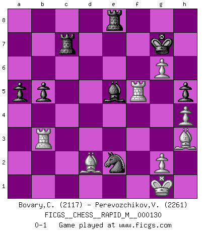 Last move : 0-1 2022 August 22 9:14:36 [Event "FICGS__CHESS__RAPID_M__000130"] [Site "FICGS"] [Date "2022.05.07"] [Round "1"] [White "Bovary,Charles"] [Black "Perevozchikov,Vjacheslav"] [Result "0-1"] [WhiteElo "2117"] [BlackElo "2261"] 1.d4 Nf6 2.c4 g6 3.Nc3 d5 4.cxd5 Nxd5 5.e4 Nxc3 6.bxc3 Bg7 7.Nf3 c5 8.Rb1 O-O 9.Be2 cxd4 10.cxd4 Qa5+ 11.Bd2 Qxa2 12.O-O Bg4 13.Be3 Nc6 14.d5 Bxf3 15.Bxf3 Ne5 16.Be2 Nc4 17.Bf4 Nb6 18.Bf3 Rfd8 19.h4 e6 20.Bg5 Rd7 21.Bg4 h6 22.Be3 h5 23.Bh3 Na4 24.Qb3 Qxb3 25.Rxb3 Nc3 26.dxe6 Rc7 27.f4 b5 28.exf7+ Kxf7 29.e5 a5 30.f5 Bxe5 31.fxg6+ Kg7 32.Rf5 Re8 33.Bd2 Ne2+ 0-1 This chess game has been lost on time (started : 2022.05.07 23:30:21) King's Indian defense, 3.Nc3 Kingside Castling by player Black (move 8) Kingside Castling by player White (move 12) Player Black won this chess game. Follow this game move after move (download)Via the squares on the chessboard, the Indians explain the movement of time and the age, the higher influences which control the world and the ties which link Chess with the human soul. (Al-Masudi) Ein Teil des Fehlers ist immer korrekt. (Savielly Grigorievitsch Tartakower) El Ajedrez te enseña a controlarl la excitación inicial que sientes cuando vez algo que parece bueno y te enseña a pensar objetivamente cuando te encuentras en problemas. (Stanley Kubrick) Le profane ne songe pas à la somme de jouissance dont il se prive, qui méconnaît ce jeu aux ressources aussi variées que passionnantes. (Jean-Marie Jeanton-Lamarche) Two beer, or not two beer. (Unknown)