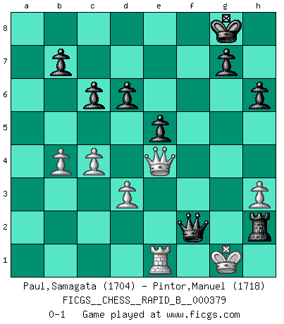 Last move : 0-1 2022 May 25 6:15:51 [Event "FICGS__CHESS__RAPID_B__000379"] [Site "FICGS"] [Date "2022.05.08"] [Round "1"] [White "Paul,Samagata"] [Black "Pintor,Manuel"] [Result "0-1"] [WhiteElo "1704"] [BlackElo "1718"] 1.e4 e5 2.c4 Bc5 3.h3 Qf6 4.Nf3 Nc6 5.d3 h6 6.Nc3 Nge7 7.Be2 d6 8.O-O O-O 9.a3 a5 10.Bd2 Qg6 11.Kh2 f5 12.exf5 Nxf5 13.Ne4 Ba7 14.b4 axb4 15.axb4 Ncd4 16.Nxd4 Nxd4 17.Be3 Bf5 18.Ng3 Nxe2 19.Nxf5 Qxf5 20.Qxe2 Bxe3 21.Rxa8 Bf4+ 22.g3 Rxa8 23.gxf4 Qxf4+ 24.Kh1 Rf8 25.Kg2 Rf5 26.Qe4 Qg5+ 27.Kh2 c6 28.Rg1 Rxf2+ 29.Kh1 Qd2 30.Re1 Rh2+ 31.Kg1 Qf2+ 0-1 King's pawn game Kingside Castling by player White (move 8) Kingside Castling by player Black (move 8) Player Black won this chess game. Follow this game move after move (download)A bad plan is better than none at all. (Frank Marshall) Schach ist Leben. (Robert James Fischer) Bobby solo arroja las piezas y solas caen en las casillas correctas. (Miguel Najdorf ) Je fais ceci parce que dans cinquante coups j'obtiendrai cela; je m'appelle Mikhail Moisevitch Botvinnik. (Botvinnik) Be who you are, and say what you feel because those who mind don't matter, and those who matter don't mind. (Dr Seuss)