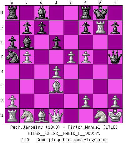Last move : 1-0 2022 June 30 22:56:30 [Event "FICGS__CHESS__RAPID_B__000379"] [Site "FICGS"] [Date "2022.05.08"] [Round "1"] [White "Pech,Jaroslav"] [Black "Pintor,Manuel"] [Result "1-0"] [WhiteElo "1903"] [BlackElo "1718"] 1.e4 e5 2.Nf3 Nc6 3.Bb5 Bc5 4.O-O Qf6 5.c3 Nge7 6.Re1 O-O 7.d4 exd4 8.e5 Qg6 9.b4 Bb6 10.Bd3 Qh5 11.b5 Na5 12.Re4 Nf5 13.g4 Qg6 14.Rf4 d6 15.cxd4 a6 16.Kh1 Qh6 17.gxf5 Qh3 18.Ng1 Qh6 19.Rg4 Qh5 20.Rxg7+ 1-0 Ruy Lopez : Classical (Cordel) defense Kingside Castling by player White (move 4) Kingside Castling by player Black (move 6) Player White won this chess game. Follow this game move after move (download)Man is a frivolous, a specious creature, and like a Chess player, cares more for the process of attaining his goal than for the goal itself. (Dostoyevsky) Kritik überlasse ich den Spießern. Ich zeige nichts, wofür ich mich schämen muss. (Alexandra Kosteniuk) El Peón aislado arroja penumbra sobre todo el tablero. (Aaron Nimzovich) À la honte des hommes, on sait que les lois du jeu sont les seules qui soient partout justes, claires, inviolables et exécutées. Pourquoi l'Indien qui a donné les règles du jeu d'échecs est-il obéi de bon gré dans toute la terre, et que les décrétales des papes, par exemple, sont aujourd'hui un objet d'horreur et de mépris ? C'est que l'inventeur des échecs combina tout avec justesse pour la satisfaction des joueurs, et que les papes, dans leurs décrétales, n'eurent en vue que leur seul avantage. L'Indien voulut exercer également l'esprit des hommes et leur donner du plaisir; les papes ont voulu abrutir l'esprit des hommes. Voltaire (Dictionnaire philosophique / Garnier 1967) God is an atheist. (Unknown)