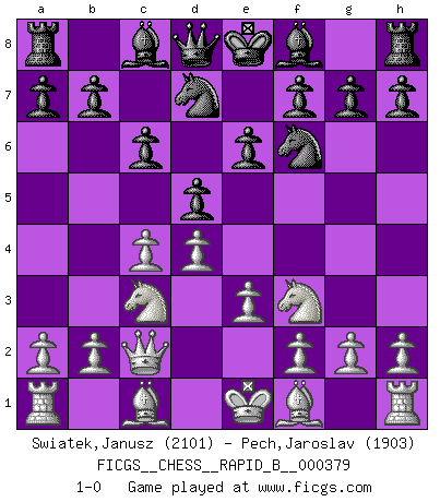 Last move : 1-0 2022 June 17 3:16:54 [Event "FICGS__CHESS__RAPID_B__000379"] [Site "FICGS"] [Date "2022.05.08"] [Round "1"] [White "Swiatek,Janusz"] [Black "Pech,Jaroslav"] [Result "1-0"] [WhiteElo "2101"] [BlackElo "1903"] 1.d4 d5 2.c4 e6 3.Nf3 Nf6 4.Nc3 c6 5.e3 Nbd7 6.Qc2 1-0 Queen's gambit declined Player White won this chess game. Follow this game move after move (download)My opponents make good moves too. Sometimes I don't take these things into consideration. (Bobby Fischer) Es ist im Leben wie im Schachspiel. Wir entwerfen einen Plan, dieser bleibt jedoch bedingt durch das, was im Schachspiel dem Gegner, im Leben dem Schicksal zu tun belieben wird. (Arthur Schopenhauer) Un sacrificio se refuta mucho mejor al aceptarlo. (Wilhelm Steinitz) La vie est comme un jeu d'échecs : nous esquissons un plan, mais celui-ci est tributaire de ce que daignent faire l'adversaire aux échecs et le destin dans la vie. (Arthur Schopenhauer) A bird doesn't sing because it has an answer, it sings because it has a song. (Maya Angelou)