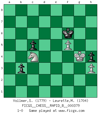 Last move : 1-0 2022 June 3 9:11:39 [Event "FICGS__CHESS__RAPID_B__000379"] [Site "FICGS"] [Date "2022.05.08"] [Round "1"] [White "Vollmer,Steve"] [Black "Leurette,Marc-Antoine"] [Result "1-0"] [WhiteElo "1779"] [BlackElo "1704"] 1.d4 d5 2.c4 e6 3.Nc3 Nf6 4.Nf3 Be7 5.Bg5 h6 6.Bh4 b6 7.e3 O-O 8.Bd3 Bb7 9.O-O Nbd7 10.Rc1 c5 11.Qe2 dxc4 12.Bxc4 a6 13.a4 Nd5 14.Bxe7 Qxe7 15.Rfd1 Nxc3 16.bxc3 Bd5 17.Bxd5 exd5 18.c4 dxc4 19.Qxc4 Rfc8 20.Qb3 Rab8 21.Qa3 Nf6 22.dxc5 bxc5 23.h3 a5 24.Rc4 Rb4 25.Rdc1 Ne4 26.Rxb4 axb4 27.Qb3 Ra8 28.Rc2 Nc3 29.Kh2 Qd6+ 30.g3 Nxa4 31.Ra2 Qc6 32.Ne5 Qc7 33.f4 Kh7 34.Rxa4 Rd8 35.Ra2 f6 36.Nc4 Qf7 37.Rc2 Qe7 38.Rd2 Rc8 39.Qd3+ g6 40.Qd7 Qxd7 41.Rxd7+ Kg8 42.Rd5 Rc6 43.Kg2 Kg7 44.Kf3 f5 45.e4 fxe4+ 46.Kxe4 Kf6 47.Rd6+ Rxd6 48.Nxd6 Ke6 49.Nc4 h5 50.g4 h4 51.f5+ gxf5+ 52.gxf5+ Kf6 53.Kf4 b3 54.Kg4 1-0 QGD : 4.Nf3 Kingside Castling by player Black (move 7) Kingside Castling by player White (move 9) 10 pieces endgame at move 48 : White KNPPP , Black KPPPP WHITE : King + 1 Knight 3 Pawns BLACK : King + 4 Pawns 9 pieces endgame at move 51 : White KNPP , Black KPPPP WHITE : King + 1 Knight 2 Pawns BLACK : King + 4 Pawns 8 pieces endgame at move 52 : White KNPP , Black KPPP WHITE : King + 1 Knight 2 Pawns BLACK : King + 3 Pawns Player White won this chess game. Follow this game move after move (download)Those who say they understand Chess, understand nothing. (Robert Hubner) Herr Iljumschinow ist ein etwas merkwürdiger Geschäftsmann: Er arbeitet zusammen mit Leuten wie Muammar al-Gaddafi; früher ist das Saddam Hussein gewesen. (Joel Lautier) Todos los Maestros de Ajedrez fueron un día unos principiantes. (Chernev) Roi des jeux et jeu des rois, les échecs portent en eux un sentiment d'infini. Ils donnent à celui qui s'est efforcé d'en approfondir les arcanes l'impression de n'être pas à la mesure de l'homme; en fait, ils constituent un résumé de l'univers, un microcosme, et figurent cette grande échelle qui, dans les plans de la lumière descend jusqu'à la matière, qui des abîmes insondables remonte jusqu'en l'infini de Dieu. (Pyrame) All maxims have their antagonist maxims; proverbs should be sold in pairs, a single one being but a half truth. (William Mathews)