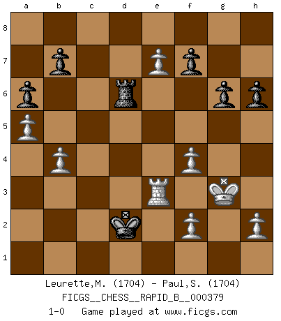 Last move : 1-0 2022 May 29 15:2:50 [Event "FICGS__CHESS__RAPID_B__000379"] [Site "FICGS"] [Date "2022.05.08"] [Round "1"] [White "Leurette,Marc-Antoine"] [Black "Paul,Samagata"] [Result "1-0"] [WhiteElo "1704"] [BlackElo "1704"] 1.e4 e5 2.Nf3 Nf6 3.Nc3 c6 4.Nxe5 Qe7 5.d4 d5 6.exd5 Nxd5 7.Nxd5 cxd5 8.Bb5+ Bd7 9.Bxd7+ Nxd7 10.O-O O-O-O 11.Re1 Qf6 12.Qf3 Nxe5 13.dxe5 Qxf3 14.gxf3 Bc5 15.b3 h6 16.Bb2 Rhe8 17.f4 Re7 18.Rad1 Kc7 19.Kg2 g6 20.Rd3 Kc6 21.Rc3 Kb5 22.a4+ Kb6 23.Rxc5 Kxc5 24.Ba3+ Kd4 25.Bxe7 Rd7 26.Bd6 Kc3 27.Re2 d4 28.b4 d3 29.cxd3 Kxd3 30.Re3+ Kd2 31.a5 a6 32.Kg3 Rd8 33.e6 Rxd6 34.e7 1-0 Petrov Three knights game Kingside Castling by player White (move 10) Queenside Castling by player Black (move 10) Player White won this chess game. Follow this game move after move (download)For me, Chess is life and every game is like a new life. Every Chess player gets to live many lives in one lifetime. (Eduard Gufeld) Wir können eben der zündenden Macht des Opfers nicht wiederstehen, denn die Begeisterung für das Opfer liegt in der Natur des Menschen. (Rudolf Spielmann) Me gusta decir que Bobby Fischer fue el mejor jugador que jamás haya existido. Pero lo que hizo de Fischer un genio, fue su habilidad de mezclar una frescura y pragmatismo Americano con ideas Rusas acerca de la estrategia. (Bruce Pandolfini) Aux échecs, les retours au sommet sont rares : les dommages psychologiques consécutifs à une défaite sont trop sévères. (Daily Telegraph) Chess is everything: art, science and sport. (Anatoly Karpov)