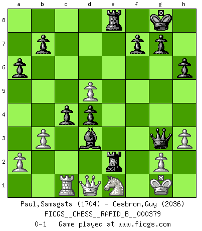 Last move : 0-1 2022 June 28 7:18:20 [Event "FICGS__CHESS__RAPID_B__000379"] [Site "FICGS"] [Date "2022.05.08"] [Round "1"] [White "Paul,Samagata"] [Black "Cesbron,Guy"] [Result "0-1"] [WhiteElo "1704"] [BlackElo "2036"] 1.e4 c5 2.c4 Nc6 3.Nf3 Nf6 4.Nc3 e6 5.d3 Be7 6.Be2 O-O 7.O-O d5 8.exd5 exd5 9.Re1 d4 10.Nb5 a6 11.Na3 h6 12.Bd2 Be6 13.h3 Rb8 14.Nh2 Bd6 15.f4 Qc7 16.Bf3 Bxf4 17.Bxf4 Qxf4 18.Nb1 Bf5 19.Nd2 Bxd3 20.Bd5 Nxd5 21.cxd5 Nb4 22.Ndf3 c4 23.Ne5 Nc2 24.Rc1 Nxe1 25.Qxe1 Rfe8 26.Qd1 Rxe5 27.b3 Re2 28.Nf3 Qg3 29.Ne1 Rbe8 0-1 Sicilian defense Kingside Castling by player Black (move 6) Kingside Castling by player White (move 7) Player Black won this chess game. Follow this game move after move (download)Half the variations which are calculated in a tournament game turn out to be completely superfluous. Unfortunately, no one knows in advance which half. (Jan Tinman) Über Kasparov: Es ist offensichtlich, daß er in einem totalitären Staat aufwuchs und deshalb zu diktatorischen Zügen neigt. (Viktor Kortschnoi) El Ajedrez no es como la vida... ¡tiene reglas!. (Mark Pasternak) Le pion, dans sa simplicité, marche droit devant lui, mais lorsqu'il prend, il le fait obliquement? Ainsi l'homme, tant qu'il reste pauvre, marche dans la droiture et vit honnêtement, mais lorsqu'il recherche les honneurs, il flatte, se parjure et, par les voies obliques, cherche une position supérieure sur l'échiquier du monde. (Jean de Galles) The Internet is so big, so powerful and pointless that for some people it is a complete substitute for life. (Andrew Brown)