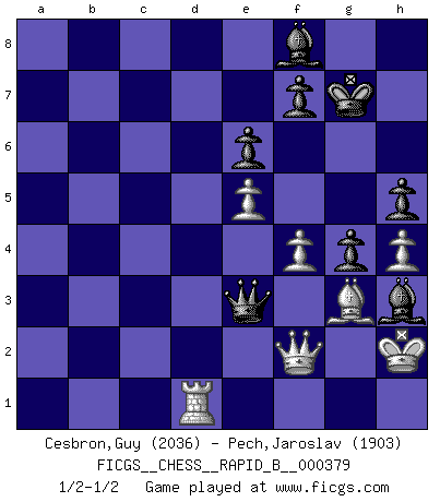 Last move : 1/2-1/2 2022 August 31 5:27:52 [Event "FICGS__CHESS__RAPID_B__000379"] [Site "FICGS"] [Date "2022.05.08"] [Round "1"] [White "Cesbron,Guy"] [Black "Pech,Jaroslav"] [Result "1/2-1/2"] [WhiteElo "2036"] [BlackElo "1903"] 1.d4 d5 2.c4 c6 3.Nf3 Nf6 4.Nc3 e6 5.Bg5 h6 6.Bh4 dxc4 7.e4 g5 8.Bg3 b5 9.Be2 Bb7 10.h4 g4 11.Ne5 h5 12.O-O Nbd7 13.Qc2 Nxe5 14.Bxe5 Bg7 15.b3 cxb3 16.axb3 O-O 17.Bg3 c5 18.e5 Nd5 19.Nxb5 cxd4 20.Nd6 Rb8 21.Rxa7 Nb4 22.Qd2 Bd5 23.Bb5 Rxb5 24.Nxb5 Nc6 25.Ra6 Bxg2 26.Rc1 Qd5 27.Raxc6 Bh3 28.f4 Qxb3 29.Nc3 dxc3 30.R6xc3 Qb5 31.Rc8 Qb7 32.Qc2 Qd5 33.Rc5 Qd4+ 34.Kh2 Rd8 35.Rc8 Rxc8 36.Qxc8+ Bf8 37.Qc2 Kg7 38.Rd1 Qe3 39.Qf2 1/2-1/2 QGD Slav : 4.Nc3 Kingside Castling by player White (move 12) Kingside Castling by player Black (move 16) This chess game ended in a draw. Follow this game move after move (download)There is only one thing Fischer does in Chess without pleasure: to lose ! (Boris Spassky) Im Internet Chess Club betrug mein Rating vorübergehend 3350 ELO-Punkte. (Sergej Karjakin) Alguna parte de un error es siempre correcto. (Savielly Tartakover) Lorsque vous vous retrouvez devant une position atroce, ne tendez pas un ultime piège dérisoire avec l'intention d'abandonner si l'adversaire le déjoue ! Faites-vous plutôt un devoir de résister comme si votre vie en dépendait. Jouez le coup qui vous déplairait au centuple si vous étiez dans la peau de votre tortionnaire ! Is not life a hundred times too short to bore ourselves ? (Friedrich Nietzsche)