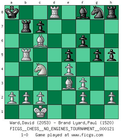 Last move : 1-0 2022 May 22 11:40:7 [Event "FICGS__CHESS__NO_ENGINES_TOURNAMENT__000121"] [Site "FICGS"] [Date "2022.05.08"] [Round "1"] [White "Ward,David"] [Black "Brand Lyard,Paul"] [Result "1-0"] [WhiteElo "2053"] [BlackElo "1520"] 1.e4 e5 2.Nf3 d6 3.d4 Bg4 4.dxe5 Bxf3 5.gxf3 dxe5 6.Qxd8+ Kxd8 7.Be3 h5 8.Nd2 a5 9.Nc4 f6 10.O-O-O Kc8 11.Bh3+ Nd7 12.Rxd7 b5 13.Rd5 Kb7 14.Rxb5+ Kc6 15.Rxa5 Rb8 16.Rd1 g5 17.Bd7+ Kb7 18.Rb5+ Ka8 19.Bc6+ Rb7 20.Rd8+ 1-0 Philidor's defense Queenside Castling by player White (move 10) Player White won this chess game. Follow this game move after move (download)All my games are real. (Bobby Fischer) Darum geht es im Schach. Einen Tag gibst du deinem Gegner eine Lektion, am nächsten Tag gibt er dir eine. (Robert James Fischer) En el tablero, la mentira e hipocresía no sobreviven mucho. (Emanuel Lasker) On entre au jeu d'Echecs comme on entre en Religion. Pour le joueur d'Echecs, la partie d'Echecs c'est l'office, la messe, le défilé du 1er Mai, le dépôt de gerbe au Monument aux Morts. C'est un drame sacré. (Michel Roos) Treat your password like your toothbrush. Don't let anybody else use it, and get a new one every six months. (Clifford Stoll)