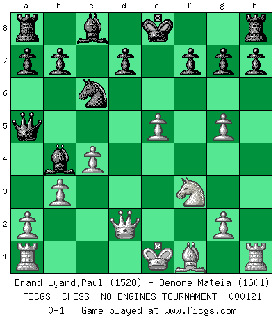 Last move : 0-1 2022 May 23 21:29:42 [Event "FICGS__CHESS__NO_ENGINES_TOURNAMENT__000121"] [Site "FICGS"] [Date "2022.05.08"] [Round "1"] [White "Brand Lyard,Paul"] [Black "Benone,Mateia"] [Result "0-1"] [WhiteElo "1520"] [BlackElo "1601"] 1.d4 Nf6 2.Bg5 Ne4 3.h4 Nxg5 4.hxg5 c5 5.f4 Qb6 6.b3 cxd4 7.c4 e5 8.fxe5 Qa5+ 9.Nd2 Nc6 10.e4 dxe3 11.Ngf3 exd2+ 12.Qxd2 Bb4 0-1 Trompowsky attack (Ruth, Opovcensky Opening) Player Black won this chess game. Follow this game move after move (download)Chess is as much a mystery as women. (Purdy) Ein guter Spieler hat immer Glück. (José Raúl Capablanca) Con el tiempo, empecé a progresar en partidas decisivas. Tal vez porque me di cuenta de una simple verdad: no solo estaba yo nervioso sino también mi oponente. (Mikhail Tal) À la honte des hommes, on sait que les lois du jeu sont les seules qui soient partout justes, claires, inviolables et exécutées. Pourquoi l'Indien qui a donné les règles du jeu d'échecs est-il obéi de bon gré dans toute la terre, et que les décrétales des papes, par exemple, sont aujourd'hui un objet d'horreur et de mépris ? C'est que l'inventeur des échecs combina tout avec justesse pour la satisfaction des joueurs, et que les papes, dans leurs décrétales, n'eurent en vue que leur seul avantage. L'Indien voulut exercer également l'esprit des hommes et leur donner du plaisir; les papes ont voulu abrutir l'esprit des hommes. Voltaire (Dictionnaire philosophique / Garnier 1967) For peace of mind, resign as general manager of the universe. (Douglas Adams)