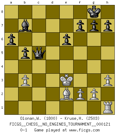 Last move : 0-1 2022 May 30 1:45:28 [Event "FICGS__CHESS__NO_ENGINES_TOURNAMENT__000121"] [Site "FICGS"] [Date "2022.05.08"] [Round "1"] [White "Olonan,Wilfredo Olanka"] [Black "Kruse,Herbert"] [Result "0-1"] [WhiteElo "1800"] [BlackElo "2503"] 1.d4 Nf6 2.h3 b5 3.a3 Bb7 4.Nd2 e6 5.e3 a6 6.b3 c5 7.dxc5 Bxc5 8.Bb2 O-O 9.c3 d5 10.Qc2 Nbd7 11.Rd1 Rc8 12.Qb1 Qb6 13.Qd3 Ne5 14.Qe2 Rfd8 15.Ngf3 Nxf3+ 16.Nxf3 Ne4 17.Nd2 Bxa3 18.Bxa3 Nxc3 19.Qg4 Nxd1 20.Qxd1 d4 21.Qe2 Rc2 22.Kd1 dxe3 23.Kxc2 Rxd2+ 24.Qxd2 exd2 25.Kxd2 Qa5+ 26.Ke3 Qxa3 27.Be2 Qc5+ 0-1 Queen's pawn game Kingside Castling by player Black (move 8) Player Black won this chess game. Follow this game move after move (download)Everything is in a state of flux, and this includes the world of Chess. (Mikhail Botvinnik) Ich spiele 70 Eröffnungssysteme. (Viktor Kortschnoi) El jugador de combinación piensa hacia adelante; comienza de la posición dada y trabaja las movidas contundentes en su mente. (Emanuel Lasker) Vous n'êtes pas toujours obligé de jouer le meilleur coup. Un coup doit être actif, entreprenant, correct et beau ! (David Bronstein) Philosophers use a language that is already deformed as though by shoes that are too tight. (Ludwig Wittgenstein)