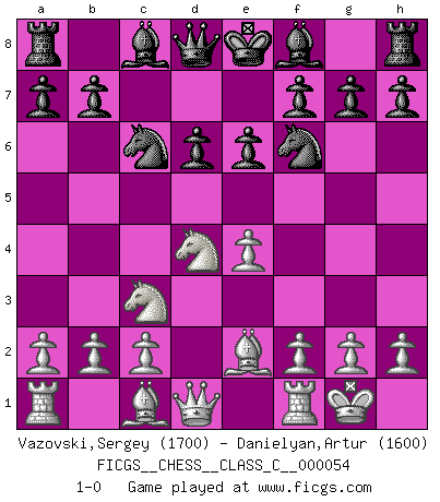 Last move : 1-0 2007 September 12 20:7:4 [Event "FICGS__CHESS__CLASS_C__000054"] [Site "FICGS"] [Date "2007.08.01"] [Round "1"] [White "Vazovski,Sergey"] [Black "Danielyan,Artur"] [Result "1-0"] [WhiteElo "1700"] [BlackElo "1600"] 1.e4 c5 2.Nf3 Nc6 3.d4 cxd4 4.Nxd4 e6 5.Nc3 d6 6.Be2 Nf6 7.O-O 1-0 This chess game has been lost on time (started : 2007.08.01 15:54:42) Sicilian defense Kingside Castling by player White (move 7) Player White won this chess game. Follow this game move after move (download)Chess books should be used as we use glasses: to assist the sight, although some players make use of them as if they thought they conferred sight. (Jose Raul Capablanca) Wenn sie aufgeben, dann danke ich Ihnen für das Spiel (Eventualzug beim Fernschach). (Anonymous) Bobby solo arroja las piezas y solas caen en las casillas correctas. (Miguel Najdorf ) Vouloir jouer aux échecs contre soi-même est aussi paradoxal que vouloir marcher sur son ombre. (Stefan Zweig) Empty your mind, be formless, shapeless — like water. (Bruce Lee)