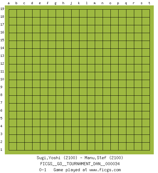 Last move : 0-1 2022 June 9 8:25:36 [Event "FICGS__GO__TOURNAMENT_DAN__000034"] [Site "FICGS"] [Date "2022.05.10"] [Round "1"] [Black "Sugi,Yoshi"] [White "Manu,Stef"] [Result "0-1"] [Rating 1 "2100"] [Rating 2 "2100"] 0-1 This go game has been lost on time (started : 2022.05.10 0:36:53) Here are the names of the openings (joseki) played in the four corners : Player White won this Go (weiqi, baduk) game. Follow this game move after move (download)There are possible things, impossible things, and things that happen. Sometimes things happen that were impossible. (Pierre Audouard) Empty your mind, be formless, shapeless — like water. (Bruce Lee)