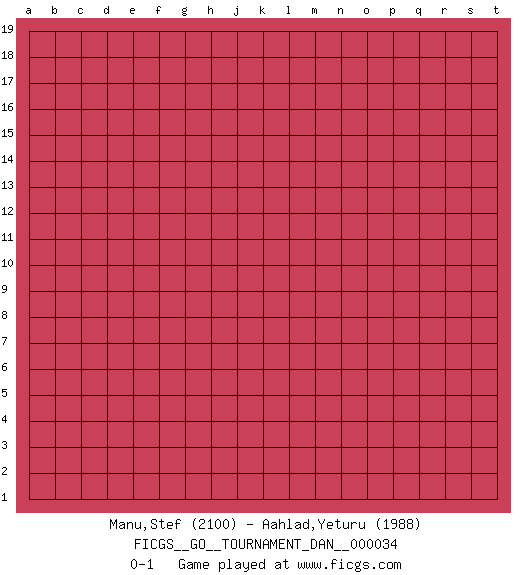Last move : 0-1 2022 June 9 8:25:36 [Event "FICGS__GO__TOURNAMENT_DAN__000034"] [Site "FICGS"] [Date "2022.05.10"] [Round "1"] [Black "Manu,Stef"] [White "Aahlad,Yeturu"] [Result "0-1"] [Rating 1 "2100"] [Rating 2 "1988"] 0-1 This go game has been lost on time (started : 2022.05.10 0:36:53) Here are the names of the openings (joseki) played in the four corners : Player White won this Go (weiqi, baduk) game. Follow this game move after move (download)Don't be greedy ! (Anonymous) Memory... is the diary that we all carry with us. (Oscar Wilde, The Importance of Being Earnest)