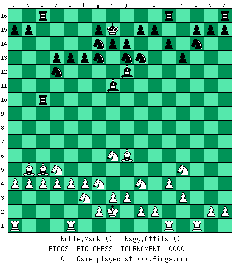 Last move : 1-0 2007 October 4 5:20:57 [Event "FICGS__BIG_CHESS__TOURNAMENT__000011"] [Site "FICGS"] [Date "2007.08.01"] [Round "1"] [White "Noble,Mark"] [Black "Nagy,Attila"] [Result "1-0"] [WhiteElo ""] [BlackElo ""] 1.j2-k4 h15-g13 2.h1-o7 p16-o14 3.o7-c7 j15-k13 4.c7-c15 h16-o10 5.h2-g4 o10-o2 6.p1-o3 o2-f10 7.d2-d4 b16-c14 8.c15-l7 k16-l14 9.b1-c3 e15-e13 10.m2-m4 n15-n13 11.l1-o4 g16-j15 12.k1-h2 o16-h10 13.l7-h10 f10-h10 14.o4-h10 m15-m14 15.n2-n3 l16-n14 16.c1-h6 f16-b12 17.e2-e4 b12-h6 18.g4-h6 d15-d13 19.f1-b5 l14-j13 20.h2-g4 j15-g14 21.o1-j6 c16-h11 22.a2-a4 a16-c16 23.f2-f4 n14-j10 24.g1-f3 c14-d12 25.j1-h2 c16-c10 26.h10-c5 e16-c16 27.b2-b4 j10-o5 28.c3-d5 j16-h15 29.c2-c4 f15-f13 30.q1-o1 o5-j12 31.o3-n5 1-0 This big chess game has been lost on time (started : 2007.08.01 20:50:51) Follow this game move after move (download)All I want to do, ever, is just play Chess. (Bobby Fischer) Kritik überlasse ich den Spießern. Ich zeige nichts, wofür ich mich schämen muss. (Alexandra Kosteniuk) De eso se trata el Ajedrez. Un día le das una lección a tu oponente y al día siguiente el te da una a tí. (Bobby Fischer) À la honte des hommes, on sait que les lois du jeu sont les seules qui soient partout justes, claires, inviolables et exécutées. Pourquoi l'Indien qui a donné les règles du jeu d'échecs est-il obéi de bon gré dans toute la terre, et que les décrétales des papes, par exemple, sont aujourd'hui un objet d'horreur et de mépris ? C'est que l'inventeur des échecs combina tout avec justesse pour la satisfaction des joueurs, et que les papes, dans leurs décrétales, n'eurent en vue que leur seul avantage. L'Indien voulut exercer également l'esprit des hommes et leur donner du plaisir; les papes ont voulu abrutir l'esprit des hommes. Voltaire (Dictionnaire philosophique / Garnier 1967) All the troubles of the world come from being unable to sit alone in a quiet room. (Blaise Pascal)