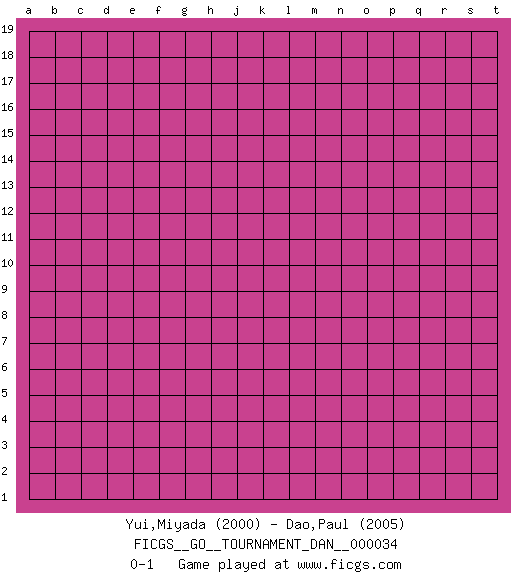 Last move : 0-1 2022 June 9 8:25:36 [Event "FICGS__GO__TOURNAMENT_DAN__000034"] [Site "FICGS"] [Date "2022.05.10"] [Round "1"] [Black "Yui,Miyada"] [White "Dao,Paul"] [Result "0-1"] [Rating 1 "2000"] [Rating 2 "2005"] 0-1 This go game has been lost on time (started : 2022.05.10 0:36:53) Here are the names of the openings (joseki) played in the four corners : Player White won this Go (weiqi, baduk) game. Follow this game move after move (download)Don't make dango's. (Anonymous) Always be a first-rate version of yourself, instead of a second-rate version of somebody else. (Judy Garland)