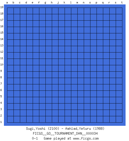 Last move : 0-1 2022 June 9 8:25:36 [Event "FICGS__GO__TOURNAMENT_DAN__000034"] [Site "FICGS"] [Date "2022.05.10"] [Round "1"] [Black "Sugi,Yoshi"] [White "Aahlad,Yeturu"] [Result "0-1"] [Rating 1 "2100"] [Rating 2 "1988"] 0-1 This go game has been lost on time (started : 2022.05.10 0:36:53) Here are the names of the openings (joseki) played in the four corners : Player White won this Go (weiqi, baduk) game. Follow this game move after move (download)Corner, side, centre. (Anonymous) Luck is when opportunity knocks and you answer. (Anonymous)