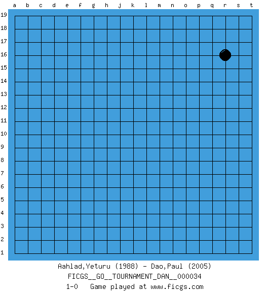Last move : 1-0 2022 June 9 21:14:11 [Event "FICGS__GO__TOURNAMENT_DAN__000034"] [Site "FICGS"] [Date "2022.05.10"] [Round "1"] [Black "Aahlad,Yeturu"] [White "Dao,Paul"] [Result "1-0"] [Rating 1 "1988"] [Rating 2 "2005"] 1.r16 1-0 This go game has been lost on time (started : 2022.05.10 0:36:53) Here are the names of the openings (joseki) played in the four corners : Player Black won this Go (weiqi, baduk) game. Follow this game move after move (download)Use a wall to attack, not to make territory. (Anonymous) All maxims have their antagonist maxims; proverbs should be sold in pairs, a single one being but a half truth. (William Mathews)