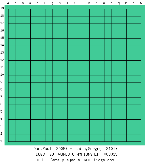 Last move : 0-1 2022 June 14 19:26:2 [Event "FICGS__GO__WORLD_CHAMPIONSHIP__000019"] [Site "FICGS"] [Date "2022.05.15"] [Round "4"] [Black "Dao,Paul"] [White "Uzdin,Sergey"] [Result "0-1"] [Rating 1 "2005"] [Rating 2 "2101"] 0-1 This go game has been lost on time (started : 2022.05.15 15:36:23) Here are the names of the openings (joseki) played in the four corners : Player White won this Go (weiqi, baduk) game. Follow this game move after move (download)Don't get surrounded ! Ever ! (Anonymous) Life is like a play: it's not the length but the excellence of the acting that matters. (Seneca)
