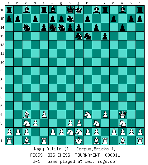 Last move : 0-1 2007 October 10 12:11:47 [Event "FICGS__BIG_CHESS__TOURNAMENT__000011"] [Site "FICGS"] [Date "2007.08.01"] [Round "1"] [White "Nagy,Attila"] [Black "Corpus,Ericko"] [Result "0-1"] [WhiteElo ""] [BlackElo ""] 1.j2-k4 j15-g14 2.h1-o7 o15-o14 3.o7-l7 l15-l14 4.l7-c15 h15-j13 5.c15-o4 g16-f14 6.b1-c3 k16-h15 7.g1-j2 b16-c14 8.e2-e4 p16-q14 9.p1-o3 q14-o15 10.f1-c4 o15-m14 11.k1-l3 m14-k13 12.d2-d3 e15-e14 13.m2-m4 m15-m13 0-1 This big chess game has been lost on time (started : 2007.08.01 20:50:51) Follow this game move after move (download)First-class players lose to second-class players because second-class players sometimes play a first-class game. (Siegbert Tarrasch) Karpov ist ein Museumsstück. (Garry Kasparov) ¿Cual es el objetivo de jugar una apertura de gambito?... Para adquirir una reputación de ser un jugador apuesto a costo de perder el juego. (Siegbert Tarrasch) Les Echecs, c'est l'art de la guerre sans les charniers, c'est la résurrection des morts tombés au champ d'honneur, l'espoir perpétuel, la suprématie de l'intelligence sur la force, la culture de l'esprit. (F. Szpiner) How many people work in NATO Headquarters ? - About half of them. (Dirk Stikker, NATO general secretary)