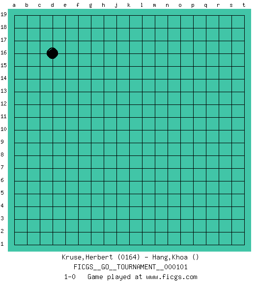 Last move : 1-0 2022 June 14 21:28:28 [Event "FICGS__GO__TOURNAMENT__000101"] [Site "FICGS"] [Date "2022.05.15"] [Round "1"] [Black "Kruse,Herbert"] [White "Hang,Khoa"] [Result "1-0"] [Rating 1 "0164"] 1.d16 1-0 This go game has been lost on time (started : 2022.05.15 17:2:10) Here are the names of the openings (joseki) played in the four corners : Player Black won this Go (weiqi, baduk) game. Follow this game move after move (download)If you cannot succeed, then die gloriously. (Chinese proverb) I can't decide which is riskier; taking crazy risks, or taking advice on crazy risks from a crazy risk taker. (Gregory House in House M.D.)