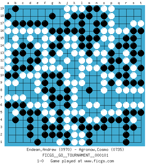 Last move : 1-0 2022 October 22 15:15:52 [Event "FICGS__GO__TOURNAMENT__000101"] [Site "FICGS"] [Date "2022.05.15"] [Round "1"] [Black "Endean,Andrew"] [White "Agronow,Cosmo"] [Result "1-0"] [Rating 1 "0970"] [Rating 2 "0735"] 1.q4 d16 2.d4 q16 3.r14 e8 4.c6 d10 5.k4 o8 6.q10 o12 7.k16 k14 8.o17 o16 9.n16 o15 10.n15 n14 11.m14 n13 12.m13 m12 13.l15 k13 14.k10 k6 15.j6 k7 16.j7 l9 17.k9 k8 18.j8 m11 19.h9 g11 20.h10 h11 21.j11 j12 22.k12 l12 23.k11 l13 24.l14 k15 25.j16 j5 26.h5 j4 27.h4 j3 28.h3 k5 29.l4 m16 30.l16 m17 31.n17 p16 32.m15 p17 33.l17 f11 34.g8 f6 35.g6 f5 36.f4 g5 37.g7 g4 38.g3 e4 39.f3 e3 40.e5 e6 41.d5 d6 42.d3 e2 43.d2 h2 44.f2 j9 45.h7 l10 46.f17 f15 47.g16 g15 48.h15 l11 49.h12 j10 50.f9 e9 51.f10 e10 52.f8 f7 53.g10 f1 54.e1 g1 55.g2 h1 56.j2 k2 57.j1 k3 58.n3 j15 59.h14 h13 60.c14 c16 61.c11 c10 62.d11 e11 63.e12 f12 64.e13 e14 65.d14 f13 66.g13 g12 67.g14 f14 68.m8 m6 69.m5 n6 70.n5 o5 71.o4 p5 72.p4 q5 73.r5 r6 74.s5 s6 75.t5 t6 76.r3 l5 77.l3 l2 78.m2 m4 79.m3 n4 80.o3 l1 81.m1 c7 82.b6 b7 83.a6 a7 84.b4 j14 85.h16 b14 86.b13 b15 87.b10 a13 88.b12 a11 89.b11 a12 90.a10 a14 91.d12 b9 92.c13 a9 93.e17 e16 94.d17 f16 95.c17 b16 96.b17 a17 97.a18 a16 98.b19 p18 99.o18 o19 100.n19 p19 101.m18 s4 102.r4 q6 103.q12 p10 104.p9 o9 105.p11 o10 106.o11 n11 107.p12 o13 108.p13 p14 109.q14 p15 110.r15 r16 111.s16 s17 112.t16 q9 113.r9 q8 114.r11 r8 115.s9 s8 116.t9 t8 117.r2 s10 118.r10 t17 119.s14 t15 120.s15 r12 121.s12 r13 122.s13 s11 123.t11 t14 124.t13 d15 125.r1 k1 126.g18 k9 127.s3 b5 128.c5 h1 129.h2 l19 130.l18 k19 131.k18 j18 132.m19 j19 133.j17 1-0 Here are the names of the openings (joseki) played in the four corners : Corner q16 : q16 r14 Hoshi (Hwajeom, Seongjeom, Xingwei`) 4-4 Point. The star or hoshi (4-4) point, emphasizing influence at the potential expense of territory. Ikken Kakari (Hankan Keolch'im, Yi Gua`jiao~, 1-Space Low Approach). Black 2 is the standard approach move to the 4-4. Corner d4 : d4 e8 Hoshi (Hwajeom, Seongjeom, Xingwei`) 4-4 Point. The star or hoshi (4-4) point, emphasizing influence at the potential expense of territory. Corner q4 : q4 o8 Hoshi (Hwajeom, Seongjeom, Xingwei`) 4-4 Point. The star or hoshi (4-4) point, emphasizing influence at the potential expense of territory. Player Black won this Go (weiqi, baduk) game. Follow this game move after move (download)Take the cutting stone on the second line. (Anonymous) It's not the size of the dog in the fight, it's the size of the fight in the dog. (Mark Twain)