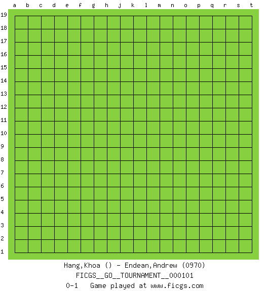 Last move : 0-1 2022 June 14 19:26:2 [Event "FICGS__GO__TOURNAMENT__000101"] [Site "FICGS"] [Date "2022.05.15"] [Round "1"] [Black "Hang,Khoa"] [White "Endean,Andrew"] [Result "0-1"] [Rating 2 "0970"] 0-1 This go game has been lost on time (started : 2022.05.15 17:2:10) Here are the names of the openings (joseki) played in the four corners : Player White won this Go (weiqi, baduk) game. Follow this game move after move (download)A meijin needs no joseki. (Anonymous) At last I discovered the true beauty of chess. So I proposed to her. (Dinesh De Silva)