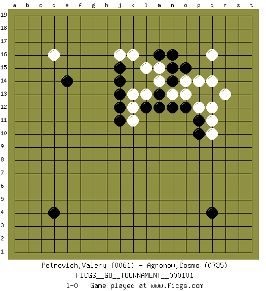 Last move : 1-0 2022 June 15 10:49:9 [Event "FICGS__GO__TOURNAMENT__000101"] [Site "FICGS"] [Date "2022.05.15"] [Round "1"] [Black "Petrovich,Valery"] [White "Agronow,Cosmo"] [Result "1-0"] [Rating 1 "0061"] [Rating 2 "0735"] 1.d4 q16 2.q4 d16 3.e14 k16 4.j14 q10 5.p10 n13 6.m12 l13 7.l12 k13 8.j13 k12 9.m13 m14 10.n12 o13 11.o12 p12 12.p11 q11 13.p13 q12 14.q13 r13 15.n14 o14 16.n15 m15 17.n16 q14 18.o15 p14 19.m16 l15 20.j15 j16 21.j12 k11 22.j11 1-0 Here are the names of the openings (joseki) played in the four corners : Corner d16 : d16 e14 Hoshi (Hwajeom, Seongjeom, Xingwei`) 4-4 Point. The star or hoshi (4-4) point, emphasizing influence at the potential expense of territory. Corner d4 : d4 1-0 Hoshi (Hwajeom, Seongjeom, Xingwei`) 4-4 Point. The star or hoshi (4-4) point, emphasizing influence at the potential expense of territory. Player Black won this Go (weiqi, baduk) game. Follow this game move after move (download)White is always trying to kill a bigger group than black is trying to save. (Anonymous) Are you threatening me, Master Jedi ? (Chancellor Palpatine in Star Wars ep.3)