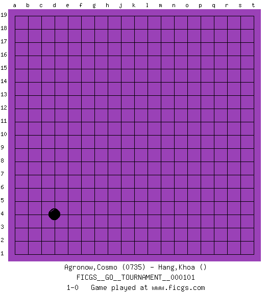 Last move : 1-0 2022 June 15 11:25:49 [Event "FICGS__GO__TOURNAMENT__000101"] [Site "FICGS"] [Date "2022.05.15"] [Round "1"] [Black "Agronow,Cosmo"] [White "Hang,Khoa"] [Result "1-0"] [Rating 1 "0735"] 1.d4 1-0 This go game has been lost on time (started : 2022.05.15 17:2:10) Here are the names of the openings (joseki) played in the four corners : Corner d4 : d4 1-0 Hoshi (Hwajeom, Seongjeom, Xingwei`) 4-4 Point. The star or hoshi (4-4) point, emphasizing influence at the potential expense of territory. Player Black won this Go (weiqi, baduk) game. Follow this game move after move (download)A knight's move near the edge of the board cannot be cut. (Bill Taylor) Locking firmely the window serves nothing, only small thiefs pass through there, the big thiefs enter through the front door. (Luc-Olivier Leclerc)