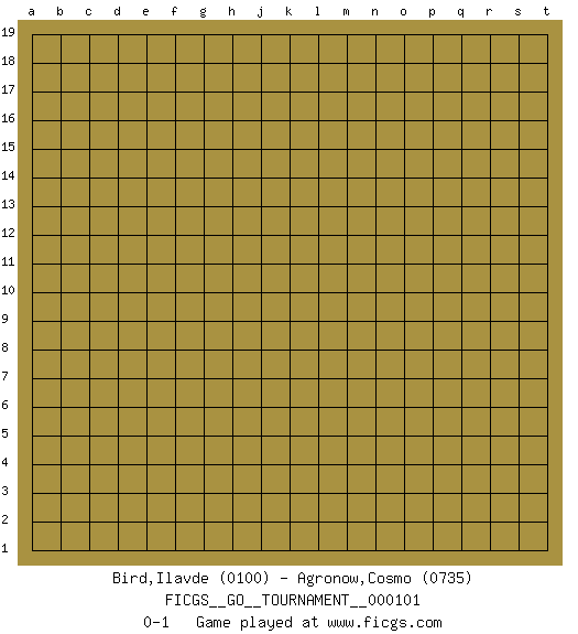 Last move : 0-1 2022 June 14 19:26:2 [Event "FICGS__GO__TOURNAMENT__000101"] [Site "FICGS"] [Date "2022.05.15"] [Round "1"] [Black "Bird,Ilavde"] [White "Agronow,Cosmo"] [Result "0-1"] [Rating 1 "0100"] [Rating 2 "0735"] 0-1 This go game has been lost on time (started : 2022.05.15 17:2:10) Here are the names of the openings (joseki) played in the four corners : Player White won this Go (weiqi, baduk) game. Follow this game move after move (download)One point in the center is worth ten in the corner. (Anonymous) Programmer - an organism that turns coffee into software. (Anonymous)