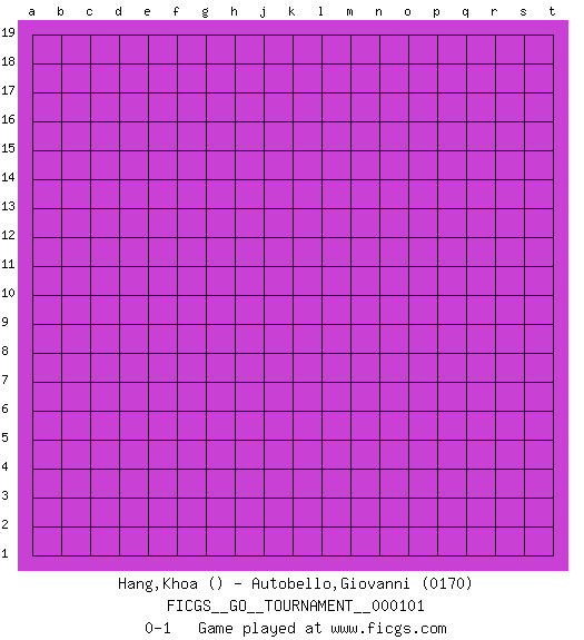 Last move : 0-1 2022 June 14 19:26:2 [Event "FICGS__GO__TOURNAMENT__000101"] [Site "FICGS"] [Date "2022.05.15"] [Round "1"] [Black "Hang,Khoa"] [White "Autobello,Giovanni"] [Result "0-1"] [Rating 2 "0170"] 0-1 This go game has been lost on time (started : 2022.05.15 17:2:10) Here are the names of the openings (joseki) played in the four corners : Player White won this Go (weiqi, baduk) game. Follow this game move after move (download)Play slow, win slow; play fast, lose fast. (Anonymous) I have opinions of my own - strong opinions - but I don't always agree with them. (George Bush)