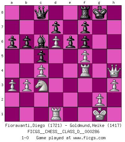 Last move : 1-0 2022 October 18 12:7:29 [Event "FICGS__CHESS__CLASS_D__000286"] [Site "FICGS"] [Date "2022.05.25"] [Round "1"] [White "Fioravanti,Diego"] [Black "Goldmund,Heike"] [Result "1-0"] [WhiteElo "1721"] [BlackElo "1417"] 1.d4 Nf6 2.c4 b6 3.Nc3 Bb7 4.Nf3 e6 5.a3 c5 6.d5 Bd6 7.e4 a6 8.e5 Bxe5 9.Nxe5 O-O 10.d6 Nc6 11.Nf3 Na5 12.Be2 Rc8 13.b3 Ba8 14.O-O Rc6 15.Ne5 Rc8 16.Bg5 h6 17.Bh4 Nc6 18.Nxc6 Bxc6 19.Qc2 Bb7 20.Rad1 Kh8 21.f4 Rc6 22.Bf3 Qc8 23.Bxc6 Bxc6 24.f5 Ng4 25.Qe2 h5 26.h3 Nf6 27.Bxf6 gxf6 28.Qxh5+ Kg8 29.Qg4+ Kh8 30.Qh4+ Kg8 31.Rf4 1-0 Queen's Indian Accelerated Kingside Castling by player Black (move 9) Kingside Castling by player White (move 14) Player White won this chess game. Follow this game move after move (download)Chess is a fighting game which is purely intellectual and includes chance. (Richard Reti) Im Leben werden Partien nie so unstrittig gewonnen wie im Spiel (Emanuel Lasker) A través de las casillas del tablero, los Indios explican el movimiento del tiempo y la edad, las influencias mas altas que controlan el mundo y los lazos que vinculan al Ajedrez con el alma humana. (Al-Masudi) La solitude du joueur d'Echecs à l'approche du mat est semblable à celle du condamné. (Francis Szpiner) A mistake is only a mistake if you let it happen twice. Otherwise it is a learning experience. (Daniel Parmet)