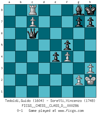 Last move : 0-1 2022 October 2 19:0:24 [Event "FICGS__CHESS__CLASS_D__000286"] [Site "FICGS"] [Date "2022.05.25"] [Round "1"] [White "Tedoldi,Guido"] [Black "Soretti,Vincenzo"] [Result "0-1"] [WhiteElo "1604"] [BlackElo "1748"] 1.c4 Nf6 2.Nc3 e6 3.d4 d5 4.cxd5 exd5 5.e3 Be7 6.h3 O-O 7.Bd3 c6 8.a3 Nbd7 9.Nf3 Re8 10.O-O Nf8 11.Bd2 Bd6 12.Rc1 Ne4 13.Bxe4 dxe4 14.Nh2 Bxh2+ 15.Kxh2 Qd6+ 16.Kg1 Qg6 17.Ne2 Ne6 18.f4 f5 19.Qe1 Bd7 20.b4 b5 21.Kh1 Nc7 22.Rg1 Nd5 23.Rc5 Nb6 24.Nc3 Nc4 25.Bc1 a5 26.Na2 axb4 27.Qxb4 Ra4 28.Qb3 Qg3 29.Nc3 R4a8 30.a4 Kh8 31.axb5 Nxe3 32.Bxe3 Qxe3 33.bxc6 Be6 34.Qb7 Qxd4 35.Qb6 Reb8 36.Qxb8+ Rxb8 37.c7 Rc8 38.Rd1 Qxc5 39.Rd8+ Bg8 40.Rxc8 Qxc3 41.Kh2 Qc6 0-1 English Opening Kingside Castling by player Black (move 6) Kingside Castling by player White (move 10) Player Black won this chess game. Follow this game move after move (download)A Chess game is a dialogue, a conversation between a player and his opponent. Each move by the opponent may contain threats or be a blunder, but a player cannot defend against threats or take advantage of blunders if he does not first ask himself: What is my opponent planning after each move ? (Bruce A. Moon) Die Elozahlen sind sehr schlecht für das Schach. Jetzt ist Schach eine Sportindustrie, die darauf zielt Elopunkte zu machen. (Miguel Najdorf) Yo creo que el Ajedrez posee una magia que es también una ayuda en la edad avanzada. Una rodilla reumática es olvidada durante una partida de Ajedrez y otros eventos pueden parecer algo sin importancia comparada a una catástrofe en el tablero de Ajedrez. (Vlastimil Hort) Toutes choses étant égales, c'est la conviction qui gagne. Alliée à une volonté de vaincre, elle sert de détonateur, suscite des idées, disperse les doutes et aide à penser clairement. (Robert Fischer) Looking at the proliferation of personal web pages on the Net, it looks like very soon everyone on Earth will have 15 megabytes of fame. (M.G. Sriram)