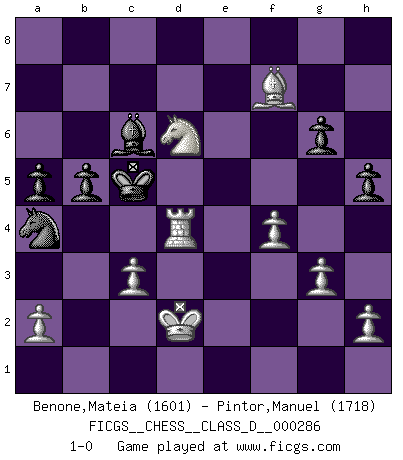 Last move : 1-0 2022 June 19 18:44:26 [Event "FICGS__CHESS__CLASS_D__000286"] [Site "FICGS"] [Date "2022.05.25"] [Round "1"] [White "Benone,Mateia"] [Black "Pintor,Manuel"] [Result "1-0"] [WhiteElo "1601"] [BlackElo "1718"] 1.e4 e5 2.Nf3 Nc6 3.d4 exd4 4.Nxd4 Qf6 5.Nb5 Bb4+ 6.N1c3 Ba5 7.Bd2 Bb6 8.Nd5 Qe5 9.Bd3 a6 10.Bf4 Qxb2 11.Nbxc7+ Bxc7 12.Nxc7+ Kd8 13.Nxa8 Nf6 14.Bc7+ Ke7 15.O-O Re8 16.e5 Nd5 17.Bc4 Nxc7 18.Qd6+ Kd8 19.Qxc7+ Ke7 20.Qd6+ Kd8 21.Bxf7 Qxe5 22.Qxe5 Rxe5 23.Rfe1 d6 24.Rxe5 Nxe5 25.Bg8 h5 26.Nb6 Bf5 27.c3 Kc7 28.Nd5+ Kd7 29.f4 Nd3 30.g3 Be4 31.Rd1 Nc5 32.Nb6+ Kc6 33.Nc4 Nd3 34.Kf1 b5 35.Ne3 Kc5 36.Ke2 Nb2 37.Rd4 Bc6 38.Nf5 Na4 39.Kd2 g6 40.Nxd6 a5 41.Bf7 1-0 Scotch game Kingside Castling by player White (move 15) Player White won this chess game. Follow this game move after move (download)Man is a frivolous, a specious creature, and like a Chess player, cares more for the process of attaining his goal than for the goal itself. (Dostoyevsky) Es macht mich traurig, wenn ich sehe, dass Golfprofis mehr verdienen als Schachsportler. Obwohl ich davon überzeugt bin, dass wir Schachspieler viel härter trainieren müssen als die Golfer. (Alexandra Kosteniuk) Un mal día en el Ajedrez, es mejor que cualquier buen día en el trabajo. (Anonymous) A ce moment-là, je menaçais de comprendre la position ! (Clément L'Heureux) Be who you are, and say what you feel because those who mind don't matter, and those who matter don't mind. (Dr Seuss)