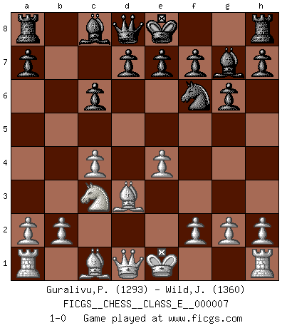 Last move : 1-0 2006 September 6 11:43:30 [Event "FICGS__CHESS__CLASS_E__000007"] [Site "FICGS"] [Date "2006.06.27"] [Round "1"] [White "Guralivu,Paul-Iosif"] [Black "Wild,Jacques"] [Result "1-0"] [WhiteElo "1293"] [BlackElo "1360"] 1.d4 Nf6 2.c4 c5 3.Nf3 cxd4 4.Nxd4 Nc6 5.Nxc6 bxc6 6.Nc3 g6 7.e4 Bg7 8.Bd3 1-0 This chess game has been lost on time (started : 2006.06.27 19:4:46) Benoni defense Player White won this chess game. Follow this game move after move (download)In Chess, as it is played by masters, chance is practically eliminated. (Emanuel Lasker) Er war ein guter Schachspieler, aber ich kann Leute nicht ausstehen, die 'Heil Hitler' rufen (Über Alexander Aljechin). (Miguel Najdorf) El Ajedrez es el juego mas altamente simbólico, pero las agresiones estan por lo tanto aún mas francamente representadas en la partida. Tal vez comenzo como un juego de guerra; Algo como la representación de una batalla en miniatura entre las fuerzas de dos reinos. (Karl Meninger) Votre prénom est 'Tactique', votre deuxième prénom est 'Tactique' et votre nom est 'Tactique'. (Ken Smith) When I took office, only high energy physicists had ever heard of what is called the World Wide Web... Now even my cat has its own page. (Bill Clinton, 1996)
