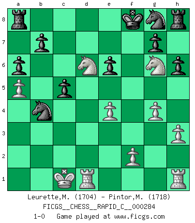 Last move : 1-0 2022 June 5 20:6:39 [Event "FICGS__CHESS__RAPID_C__000284"] [Site "FICGS"] [Date "2022.05.28"] [Round "1"] [White "Leurette,Marc-Antoine"] [Black "Pintor,Manuel"] [Result "1-0"] [WhiteElo "1704"] [BlackElo "1718"] 1.e4 e5 2.Nf3 Nc6 3.Bc4 Bc5 4.c3 Qf6 5.b4 Bb6 6.a4 a6 7.a5 Ba7 8.d3 h6 9.Qe2 d6 10.Be3 Bg4 11.Nbd2 Bxe3 12.Qxe3 Qg6 13.h3 Qh5 14.O-O-O Be6 15.g4 Qg6 16.d4 Bxc4 17.Nxc4 exd4 18.cxd4 Nxb4 19.Qb3 c5 20.dxc5 dxc5 21.Nd6+ Kf8 22.Ne5 Qe6 23.Qxe6 fxe6 24.Ng6+ 1-0 Giuoco Piano Queenside Castling by player White (move 14) Player White won this chess game. Follow this game move after move (download)I have added these principles to the law: get the Knights into action before both Bishops are developed. (Emanuel Lasker) Im Schach gewinnt jeder. Hat man Freunde am Spiel - und das ist die Hauptsache - ist auch der Verlust einer Partie kein Unglück. (David Bronstein) Mis oponentes también hacen buenas movidas. A veces yo no tomo esas cosas en consideración. (Bobby Fischer) Vous savez, camarade Pachman, je n'éprouve pas de plaisir à être ministre, je jouerais plutôt aux échecs comme vous, ou alors ferais une révolution au Venezuela. (Che Guevara à Ludek Pachman, 'Checkmate in Prague', 1975) The message for business people contemplating their place in the cyberspace is simple and direct: get linked or get lost. (Vic Sussman and Kenan Pollack)