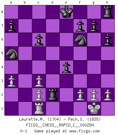 Last move : 0-1 2022 July 20 11:34:51 [Event "FICGS__CHESS__RAPID_C__000284"] [Site "FICGS"] [Date "2022.05.28"] [Round "1"] [White "Leurette,Marc-Antoine"] [Black "Pech,Stepan"] [Result "0-1"] [WhiteElo "1704"] [BlackElo "1835"] 1.e4 e5 2.Nf3 Nc6 3.Bc4 Nf6 4.Ng5 d5 5.exd5 Na5 6.Bb5+ c6 7.dxc6 bxc6 8.Ba4 h6 9.Nf3 e4 10.Qe2 Be6 11.Nd4 Qxd4 12.Nc3 Bb4 13.a3 Bxc3 14.dxc3 Qxa4 15.O-O Bc4 16.Qd1 Rd8 17.Bd2 Bxf1 18.Kxf1 Qb5+ 19.Kg1 Qxb2 20.Qc1 Qxc1+ 21.Rxc1 Rxd2 0-1 Two knights defense Kingside Castling by player White (move 15) Player Black won this chess game. Follow this game move after move (download)Later, I began to succeed in decisive games. Perhaps because I realized a very simple truth: not only was I worried, but also my opponent. (Mikhail Tal) Stil? Ich habe keinen Stil! (Anatoly Karpov) Buenas posiciones no logran ganar juegos, buenas movidas sí. (Gerald Abrahams) Karpov est une pièce de musée. (Garry Kasparov) Luck never made a man wise. (Seneca, Letters to Lucilius)