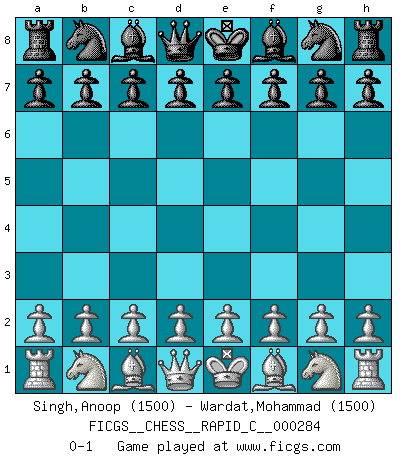 Last move : 0-1 2022 June 28 0:5:15 [Event "FICGS__CHESS__RAPID_C__000284"] [Site "FICGS"] [Date "2022.05.28"] [Round "1"] [White "Singh,Anoop"] [Black "Wardat,Mohammad"] [Result "0-1"] [WhiteElo "1500"] [BlackElo "1500"] 0-1 This chess game has been lost on time (started : 2022.05.28 23:23:20) Player Black won this chess game. Follow this game move after move (download)Chess holds its master in its own bonds, shackling the mind and brain so that the inner freedom of the very strongest must suffer. (Albert Einstein) Wie kann ich Remis annehmen? Ich weiß ja gar nicht, wie ich stehe! (Fritz Sämisch) No hay un Gran Maestro de Ajedrez que sea normal; solo se diferencían ellos por la magnitud de su locura. (Viktor Korchnoi) Vous n'êtes pas toujours obligé de jouer le meilleur coup. Un coup doit être actif, entreprenant, correct et beau ! (David Bronstein) All men can see these tactics whereby I conquer, but what none can see is the strategy out of which victory is evolved. (Sun Tzu)