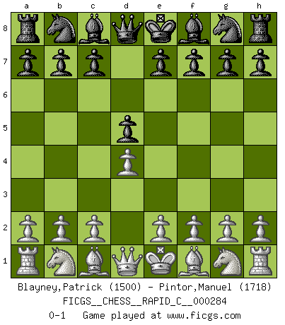 Last move : 0-1 2022 June 29 2:50:28 [Event "FICGS__CHESS__RAPID_C__000284"] [Site "FICGS"] [Date "2022.05.28"] [Round "1"] [White "Blayney,Patrick"] [Black "Pintor,Manuel"] [Result "0-1"] [WhiteElo "1500"] [BlackElo "1718"] 1.d4 d5 0-1 This chess game has been lost on time (started : 2022.05.28 23:23:20) Queen's pawn game Player Black won this chess game. Follow this game move after move (download)Whoever sees no other aim in the game than that of giving checkmate to one's opponent will never become a good Chess player. (Euwe) Ich liebe den Moment, wenn ich das Ego meines Gegenüber breche. (Robert James Fischer) Si no le temes a Spassky, entonces elimino el elemento del dinero. (Jim Slater) Echiquier : carré parfait, comme la Jérusalem nouvelle décrite par l'auteur de l'Apocalypse, huit cases sur huit, exaltation du chiffre 4, symbole du cosmos aux quatre horizons... où le noir et le blanc, l'ombre et la lumière, le mal et le bien s'entremêlent et se conjuguent. (Robert Couffignal, Le Gambit du poète) The production of too many useful things results in too many useless people. (Karl Marx)