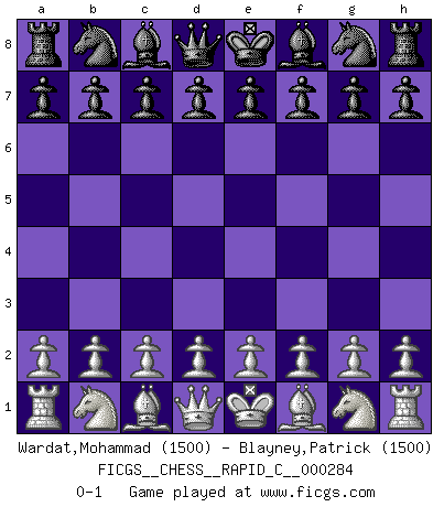 Last move : 0-1 2022 June 28 0:5:15 [Event "FICGS__CHESS__RAPID_C__000284"] [Site "FICGS"] [Date "2022.05.28"] [Round "1"] [White "Wardat,Mohammad"] [Black "Blayney,Patrick"] [Result "0-1"] [WhiteElo "1500"] [BlackElo "1500"] 0-1 This chess game has been lost on time (started : 2022.05.28 23:23:20) Player Black won this chess game. Follow this game move after move (download)We must make sure that Chess will not be like a dead language, very interesting, but for a very small group. (Sytze Faber) Kein Großmeister ist normal. Sie unterscheiden sich nur im Ausmaß Ihrer Verrücktheit. (Viktor Kortschnoi) Un sacrificio se refuta mucho mejor al aceptarlo. (Wilhelm Steinitz) Demandez au pauvre Cg1 ce qu'il en pense. Eduard Gufeld à propos de la variante Saemisch de l'Est-Indienne. A shortcut is the longest distance between two points. (Don Groves)