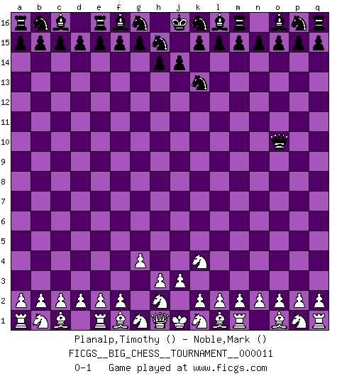 Last move : 0-1 2007 September 3 6:57:31 [Event "FICGS__BIG_CHESS__TOURNAMENT__000011"] [Site "FICGS"] [Date "2007.08.01"] [Round "1"] [White "Planalp,Timothy"] [Black "Noble,Mark"] [Result "0-1"] [WhiteElo ""] [BlackElo ""] 1.g2-g4 j15-k13 2.j2-k4 h16-o10 0-1 This big chess game has been lost on time (started : 2007.08.01 20:50:51) Follow this game move after move (download)It is peculiar but a fact nevertheless, that gamblers in chess always have enthusiastic followers. (Botvinnik) Wenn man heute mit 14 Jahren noch kein GM ist, kann man es vergessen. (Viswanathan Anand) El Ajedrez es un terrible juego. Si no controlas el centro, tu oponente tiene una posición mas holgada. Si tienes control del centro, ¡entonces realmente tu tienes algo de que preocuparte!. (Siegbert Tarrasch) RxDa4 pat (...) Wisdom doesn't necessarily come with age. Sometimes age just shows up all by itself. (Tom Wilson)