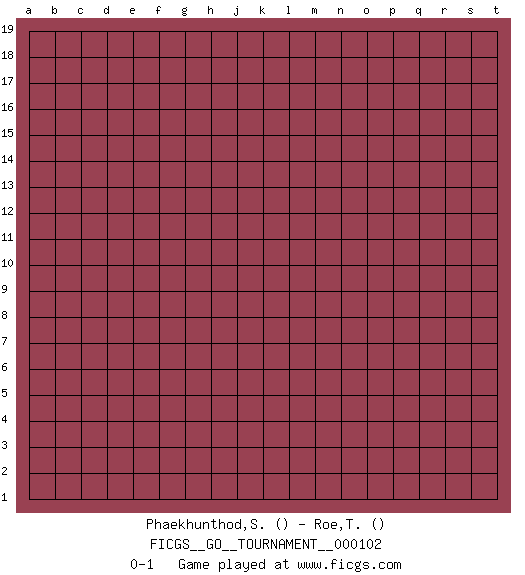 Last move : 0-1 2022 July 2 1:5:16 [Event "FICGS__GO__TOURNAMENT__000102"] [Site "FICGS"] [Date "2022.06.01"] [Round "1"] [Black "Phaekhunthod,Supronthip"] [White "Roe,Tamara"] [Result "0-1"] 0-1 This go game has been lost on time (started : 2022.06.01 17:14:15) Here are the names of the openings (joseki) played in the four corners : Player White won this Go (weiqi, baduk) game. Follow this game move after move (download)Atari, atari is vulgar play. (Anonymous) May I never be complete. May I never be content. May I never be perfect. Deliver me, Tyler, from being perfect and complete. (Chuck Palahniuk, Fight Club)