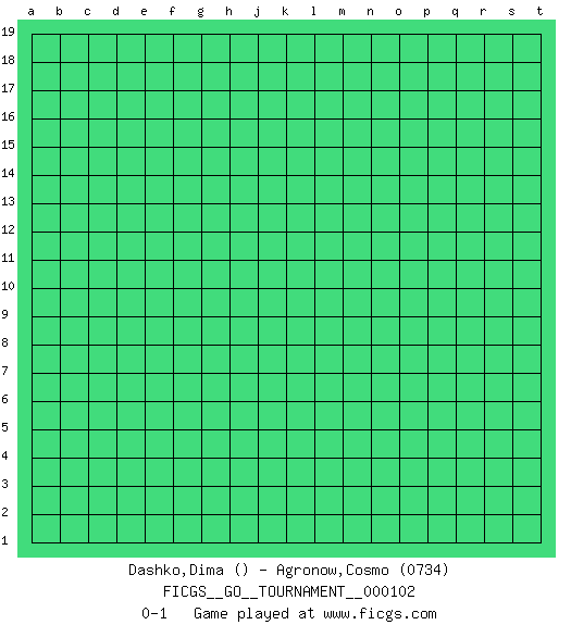 Last move : 0-1 2022 July 2 1:5:16 [Event "FICGS__GO__TOURNAMENT__000102"] [Site "FICGS"] [Date "2022.06.01"] [Round "1"] [Black "Dashko,Dima"] [White "Agronow,Cosmo"] [Result "0-1"] [Rating 2 "0734"] 0-1 This go game has been lost on time (started : 2022.06.01 17:14:15) Here are the names of the openings (joseki) played in the four corners : Player White won this Go (weiqi, baduk) game. Follow this game move after move (download)Good moves and bad moves are bedfellows. (Anonymous) To steal ideas from one person is plagiarism. To steal from many is research. (Unknown)