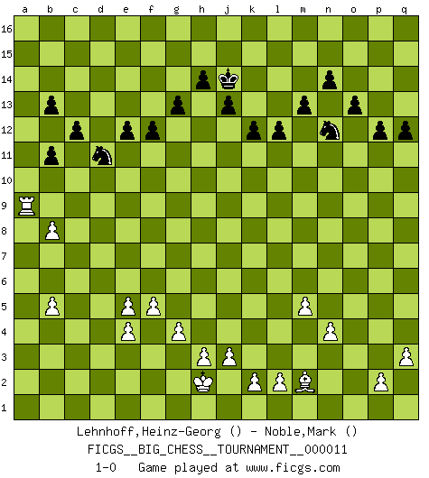 Last move : 1-0 2007 September 24 0:18:12 [Event "FICGS__BIG_CHESS__TOURNAMENT__000011"] [Site "FICGS"] [Date "2007.08.01"] [Round "1"] [White "Lehnhoff,Heinz-Georg"] [Black "Noble,Mark"] [Result "1-0"] [WhiteElo ""] [BlackElo ""] 1.j2-k4 h15-g13 2.h1-o7 p16-o14 3.o7-c7 j15-k13 4.c7-c15 h16-o10 5.h2-g4 o10-o2 6.m2-m4 o2-o13 7.e2-e4 b16-c14 8.c15-o4 m15-m13 9.n2-n4 e15-e13 10.d2-d4 f16-b12 11.g1-j2 d15-d14 12.c2-c4 c16-k9 13.f2-f3 a16-c16 14.c4-c5 p15-p14 15.b1-c3 o16-p15 16.c1-k8 g16-j15 17.b2-b4 o14-n12 18.k8-j9 b12-g7 19.j9-p15 g7-p15 20.e1-d1 c14-d12 21.o1-l4 c16-c10 22.l4-d11 k9-f13 23.d11-c10 f13-c10 24.o4-o13 l16-o13 25.f1-c4 n15-n14 26.p1-q3 k16-l14 27.m1-o1 j15-h13 28.o1-o7 a15-a13 29.o7-a7 a13-a12 30.q1-o1 b15-b13 31.g4-e5 l14-k12 32.m4-m5 k13-j11 33.l1-n3 l15-l13 34.o1-o6 j16-j15 35.k1-l3 k15-k13 36.j1-h2 g13-j12 37.c3-b5 g15-g13 38.a1-b1 f15-f13 39.b5-d6 e16-c16 40.c4-f7 c10-e12 41.d6-c4 c16-c13 42.o6-c6 m16-c16 43.a7-a6 e12-g10 44.c6-c13 c16-c13 45.b4-b5 q16-c16 46.c4-d6 p15-e5 47.d4-e5 c13-c5 48.f3-f4 n12-l11 49.j2-g3 h13-f12 50.a6-a4 f12-e10 51.a4-c4 c5-c4 52.f7-c4 c16-c9 53.q3-o4 j12-g11 54.d1-c1 c9-q9 55.q2-q3 g11-e12 56.c4-e6 e12-c13 57.c1-c7 q9-e9 58.e6-f5 o13-f5 59.g3-f5 j11-g12 60.a2-a4 e9-a9 61.b1-b4 l11-n12 62.g2-g4 o15-o13 63.f5-e7 g10-d13 64.d6-b7 a9-n9 65.b4-d4 d13-c12 66.d4-d9 n9-n11 67.a4-a5 d14-d13 68.f4-f5 c13-b11 69.a5-a6 d12-f11 70.e7-c8 e13-e12 71.c8-b10 q15-q13 72.b10-c12 d13-c12 73.b7-a9 f11-e13 74.a9-b11 n11-b11 75.c7-b7 b11-b7 76.a6-b7 e13-d11 77.k4-h5 g12-e13 78.h5-f6 e13-c14 79.f6-d7 c14-a13 80.l3-k5 a13-b11 81.b7-b8 p14-p13 82.k5-h6 q13-q12 83.h6-f7 p13-p12 84.n3-m2 k12-h11 85.o4-n6 j14-j13 86.n6-l7 j15-j14 87.l7-j8 l13-l12 88.j8-g9 h11-g9 89.f7-g9 e10-g9 90.d9-g9 k13-k12 91.d7-c9 f13-f12 92.c9-b11 a12-b11 93.g9-a9 1-0 Follow this game move after move (download)Chess is a forcing house where the fruits of character can ripen more fully than in life. (Edward Morgan Foster) Die Neutralität betrachte ich als eine schwere Krankheit. (Viktor Kortschnoi) La pasion por jugar al Ajedrez es una de las mas inexplicables en el mundo. (H.G. Wells) Assurément je connaissais par expérience le mystérieux attrait de ce jeu royal, le seul entre tous les jeux inventés par les hommes qui échappe souverainement à la tyrannie du hasard, le seul où l'on ne doive sa victoire qu'à son intelligence ou plutôt à une certaine forme d'intelligence. Mais n'est-ce pas déjà le limiter injurieusement que d'appeler les échecs un jeu ? N'est-ce pas une science, un art ou quelque chose qui, comme le cercueil de Mahomet entre ciel et terre, est suspendu entre l'un et l'autre, et qui réunit un nombre incroyable de contraires ? [...] C'est une pensée qui ne mène à rien, une mathématique qui n'établit rien, un art qui ne laisse pas d'uvre, une architecture sans matière; et il l'a prouvé néanmoins qu'il était plus durable, à sa manière, que les livres ou que tout autre monument, ce jeu unique qui appartient à tous les peuples et à tous les temps, et dont personne ne sait quel dieu en fit don à la terre pour tuer l'ennui, pour aiguiser l'esprit et stimuler l'âme. Où commence-t-il, où finit-il ? (Stefan Zweig) A journey of a thousand sites begins with a single click. (Author unknown)