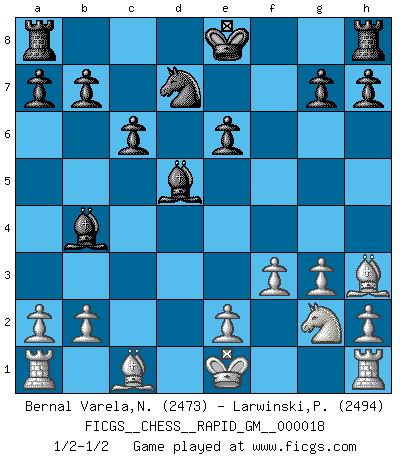 Last move : 1/2-1/2 2022 July 6 18:4:58 [Event "FICGS__CHESS__RAPID_GM__000018"] [Site "FICGS"] [Date "2022.06.02"] [Round "1"] [White "Bernal Varela,Nelson"] [Black "Larwinski,Paul"] [Result "1/2-1/2"] [WhiteElo "2473"] [BlackElo "2494"] 1.c3 d5 2.d4 Nf6 3.Nf3 Bf5 4.Qb3 Qc8 5.c4 c6 6.Nc3 e6 7.Nh4 dxc4 8.Qxc4 Bc2 9.d5 Be7 10.dxe6 Qxe6 11.Qxe6 fxe6 12.g3 Nbd7 13.Bh3 Ne4 14.Nxe4 Bxe4 15.f3 Bd5 16.Ng2 Bb4+ 17.Kf2 Bc5+ 18.Ke1 Bb4+ 1/2-1/2 Saragossa Opening This chess game ended in a draw. Follow this game move after move (download)By playing at Chess then, we may learn: First: Foresight... Second: Circumspection... Third: Caution... And lastly, we learn by Chess the habit of not being discouraged by present bad appearances in the state of our affairs, the habit of hoping for a favorable chance, and that of persevering in the secrets of resources. (Benjamin Franklin) Es ist besser die Steine des Gegners zu opfern. (Savielly Grigorievitsch Tartakower) El Ajedrez es un expediente tonto que hace creer a la gente inactiva que hacen una cosa muy astuta cuando solamente estan perdiendo su tiempo. (George Bernard Shaw) Fischer est le meilleur joueur du monde et Karpov n'est qu'un joueur de bistrot. (Garry Kasparov, agé de 16 ans) A good book on your shelf is a friend that turns its back on you and remains a friend. (Author unknown)