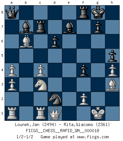 Last move : 1/2-1/2 2022 July 11 15:25:42 [Event "FICGS__CHESS__RAPID_GM__000018"] [Site "FICGS"] [Date "2022.06.02"] [Round "1"] [White "Lounek,Jan"] [Black "Rita,Giacomo"] [Result "1/2-1/2"] [WhiteElo "2494"] [BlackElo "2361"] 1.e4 c5 2.Nf3 d6 3.d4 cxd4 4.Nxd4 Nf6 5.Nc3 a6 6.h3 e5 7.Nde2 h5 8.g3 Be7 9.Bg2 b5 10.Nd5 Nxd5 11.Qxd5 Ra7 12.Be3 Rb7 13.Qd2 Nd7 14.b3 Rc7 15.O-O Bb7 16.Rfc1 O-O 17.c4 b4 18.h4 a5 19.a3 Nc5 20.Qc2 a4 21.bxa4 b3 22.Qb1 Nxe4 23.Qxb3 Qa8 24.Bh3 f5 25.Nc3 f4 26.gxf4 exf4 27.Bb6 Nd2 28.Qd1 1/2-1/2 Sicilian : Najdorf, Adams attack Kingside Castling by player White (move 15) Kingside Castling by player Black (move 16) This chess game ended in a draw. Follow this game move after move (download)Chess is really ninety nine percent calculation. (Soltis) Jeder leidlich begabte Spieler, er braucht keineswegs hervorragend veranlagt zu sein, kann es zum Meister bringen. Aber das ist ja auch gar nicht nötig! Der richtige Standpunkt ist es, zu seinem Vergnügen zu spielen, und man glaube ja nicht, dass der Genuss proportional dem Können sei. (Siegbert Tarrasch) Antes de los Finales, los dioses han colocado el Juego Medio. (Siegbert Tarrasch) Que feriez-vous si vous étiez en train de jouer aux échecs et que la fin du monde arrive ? Je continuerais à jouer. (Saint Borromée) Children in the dark cause accidents, accidents in the dark cause children. (Unknown)