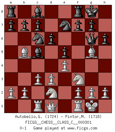 Last move : 0-1 2022 July 15 6:46:25 [Event "FICGS__CHESS__CLASS_C__000301"] [Site "FICGS"] [Date "2022.06.02"] [Round "1"] [White "Autobello,Giovanni"] [Black "Pintor,Manuel"] [Result "0-1"] [WhiteElo "1724"] [BlackElo "1718"] 1.e4 e5 2.Nf3 Nc6 3.Bb5 Bc5 4.O-O Qf6 5.c3 Nge7 6.d3 O-O 7.Bg5 Qg6 8.Nbd2 d6 9.Rc1 h6 0-1 This chess game has been lost on time (started : 2022.06.02 19:15:26) Ruy Lopez : Classical (Cordel) defense Kingside Castling by player White (move 4) Kingside Castling by player Black (move 6) Player Black won this chess game. Follow this game move after move (download)In Fischer's hands, a slight theoretical advantage is as good a being a Queen ahead. (Isaac Kashdan) Ich kenne keine einzige Person, die behaupten würde, Garri Kasparow sei ein guter Mensch (Nigel Short) Cuando tengo las piezas blancas, yo gano porque soy blanco; Cuando tengo las piezas negras, yo gano porque soy Bogolyubov. (Bogolyubov) Il vaut toujours mieux jouer un plan faux de façon logique que de n'avoir pas de plan du tout. (Victor Kortchnoï) Macintosh - we might not get everything right, but at least we knew the century was going to end. (Douglas Adams)