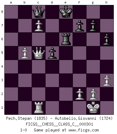 Last move : 1-0 2023 May 14 10:27:38 [Event "FICGS__CHESS__CLASS_C__000301"] [Site "FICGS"] [Date "2022.06.02"] [Round "1"] [White "Pech,Stepan"] [Black "Autobello,Giovanni"] [Result "1-0"] [WhiteElo "1835"] [BlackElo "1724"] 1.e4 e5 2.Nf3 Nc6 3.Bb5 a6 4.Ba4 Nf6 5.O-O Bc5 6.c3 d6 7.d4 exd4 8.cxd4 Ba7 9.d5 b5 10.dxc6 bxa4 11.Nc3 O-O 12.Qxa4 h6 13.h3 Re8 14.Rd1 Qe7 15.Re1 Rb8 16.b3 Bc5 17.Ba3 Bxa3 18.Qxa3 Nh7 19.Nd5 Qd8 20.Qa5 Ng5 21.Nxg5 Qxg5 22.Re3 Be6 23.Qxc7 Bxd5 24.exd5 Qxd5 25.Rxe8+ Rxe8 26.Qd7 Qe5 27.Rc1 Qe6 28.b4 Kf8 29.Qa7 Qc8 30.c7 Re7 31.Qb6 Re6 32.a4 d5 33.Qc5+ Ke8 34.b5 axb5 35.axb5 1-0 This chess game has been lost on time (started : 2022.06.02 19:15:26) Ruy Lopez : Moeller defense Kingside Castling by player White (move 5) Kingside Castling by player Black (move 11) Player White won this chess game. Follow this game move after move (download)By this measure (on the gap between Fischer & his contemporaries), I consider him the greatest world champion. (Garry Kasparov) Mein Name ist Rustam Kamsky. Sie haben meinen Sohn belästigt. Bereiten Sie sich aufs Sterben vor. (Rustam Kamsky) La batalla por la última verdad nunca sera ganada. Y es por eso que el Ajedrez es tan fascinante. (Hans Kmoch) Je crois qu'il existe des manières très spécifiques de jouer efficacement contre une machine. Evidemment, nous n'avons aucune chance en technique pure, parce que l'ordinateur calcule de manière parfaite. Mais lorsque nous faisons appel à notre cerveau, en utilisant l'intuition et la compréhension, alors nous restons beaucoup plus forts. (Anatoli Karpov) A good teacher is like a candle - it consumes itself to light the way for others. (Author unknown)