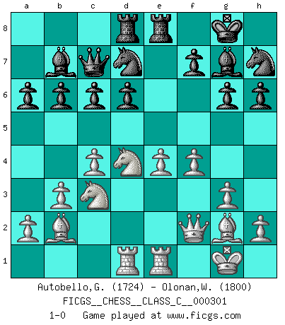 Last move : 1-0 2022 November 7 14:0:41 [Event "FICGS__CHESS__CLASS_C__000301"] [Site "FICGS"] [Date "2022.06.02"] [Round "1"] [White "Autobello,Giovanni"] [Black "Olonan,Wilfredo Olanka"] [Result "1-0"] [WhiteElo "1724"] [BlackElo "1800"] 1.c4 e5 2.Nc3 a6 3.Nf3 d6 4.g3 h6 5.Bg2 Nd7 6.O-O c6 7.d3 b6 8.b3 Qc7 9.Bb2 Bb7 10.e4 Ngf6 11.Re1 g6 12.Rc1 Rd8 13.d4 exd4 14.Nxd4 Bg7 15.f4 O-O 16.Qc2 Nh7 17.Rcd1 Rfe8 18.Qf2 1-0 This chess game has been lost on time (started : 2022.06.02 19:15:26) English Opening Kingside Castling by player White (move 6) Kingside Castling by player Black (move 15) Player White won this chess game. Follow this game move after move (download)When the Chess game is over, the Pawn and the King go back to the same box. (Irish saying) Ich bewundere Kasparows phantasievolle Angriffssiege aus den Achtzigern und Neunzigern, aber wenn man sie mit dem Computer überprüft, nimmt der Computer in jeder zweiten Partie die Opfer an, verteidigt sich und gewinnt. (Vladimir Kramnik) Repentinamente, me resultaba obvio en mi analisis que yo había pasado por alto lo que Fischer había visto en el tablero con la mas grande facilidad. (Mikhail Botvinnik) Je ne suis pas le dernier à jouer lâchement des coups douteux pendant le zeïtnot de l'adversaire pour l'achever: en effet les coups qui font le plus peur sont ceux que l'on ne comprend pas. Je me fais souvent peur quand je joue. (Un professeur anonyme) I don't believe in psychology. I believe in good moves. (Bobby Fischer)