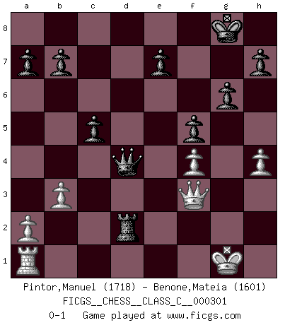 Last move : 0-1 2022 June 29 19:3:45 [Event "FICGS__CHESS__CLASS_C__000301"] [Site "FICGS"] [Date "2022.06.02"] [Round "1"] [White "Pintor,Manuel"] [Black "Benone,Mateia"] [Result "0-1"] [WhiteElo "1718"] [BlackElo "1601"] 1.e4 c5 2.f4 Nf6 3.Nc3 d5 4.exd5 Nxd5 5.Nxd5 Qxd5 6.Nf3 Bg4 7.Be2 Nc6 8.O-O g6 9.c3 Bg7 10.Kh1 O-O 11.h3 Bf5 12.Nh4 Bxh3 13.Bf3 Qd7 14.Rf2 Be6 15.d3 Bf6 16.g3 Rad8 17.Be4 Bxh4 18.gxh4 f5 19.Bxc6 Qxc6+ 20.Kh2 Rd6 21.Qf3 Qa6 22.c4 Rfd8 23.Rd2 Bxc4 24.dxc4 Rxd2+ 25.Bxd2 Rxd2+ 26.Kg1 Qxc4 27.b3 Qd4+ 0-1 Sicilian : Grand Prix attack Kingside Castling by player White (move 8) Kingside Castling by player Black (move 10) Player Black won this chess game. Follow this game move after move (download)I had a toothache during the first game. In the second game I had a headache. In the third game it was an attack of rheumatism. In the fourth game, I wasn't feeling well. And in the fifth game? Well, must one have to win every game ? (Siegbert Tarrasch) Du weisst es gibt ein Problem mit Computern und Fernschach, wenn jeder eine Rating von 2450 hat. (John Christen Knudsen) El Ajedrez no es como la vida... ¡tiene reglas!. (Mark Pasternak) Horreur, mais aussi harmonie suprême : qu'y avait-il en effet au monde en dehors des échecs ? Le brouillard, l'inconnu, le non-être... (Vladimir Nabokov) The large trees attract high winds. (Chinese proverb)