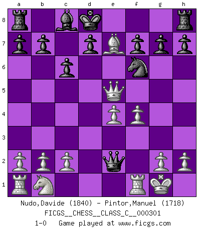 Last move : 1-0 2022 June 26 0:15:21 [Event "FICGS__CHESS__CLASS_C__000301"] [Site "FICGS"] [Date "2022.06.02"] [Round "1"] [White "Nudo,Davide"] [Black "Pintor,Manuel"] [Result "1-0"] [WhiteElo "1840"] [BlackElo "1718"] 1.e4 e5 2.Nf3 Nc6 3.Bb5 Bc5 4.Nxe5 Qh4 5.O-O Nxe5 6.d4 Bd6 7.dxe5 Bxe5 8.f4 Bd6 9.Be3 c6 10.Qxd6 Nf6 11.Bf2 Qh5 12.Bc5 Kd8 13.Qe7+ Kc7 14.Be2 Qxe2 15.Qe5+ Kd8 16.Be7+ 1-0 Ruy Lopez : Classical (Cordel) defense Kingside Castling by player White (move 5) Player White won this chess game. Follow this game move after move (download)Chess is a beautiful mistress. (Bent Larsen) Schachspieler können ausgezeichnet Varianten am Schachbrett berechnen, aber nicht im realen Leben. Zu stark ist der Individualismus im Schach ausgeprägt, und für viele ist ein kleiner momentaner persönlicher Vorteil wichtiger als ein weit größerer Vorteil von morgen. (Anatoly Karpov) Antes de los Finales, los dioses han colocado el Juego Medio. (Siegbert Tarrasch) Fischer est le meilleur joueur du monde et Karpov n'est qu'un joueur de bistrot. (Garry Kasparov, agé de 16 ans) Train yourself to let go of everything you fear to lose. (Master Yoda in Star Wars ep.3)