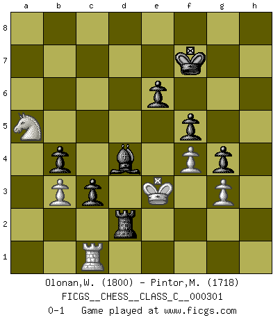 Last move : 0-1 2022 July 16 6:48:55 [Event "FICGS__CHESS__CLASS_C__000301"] [Site "FICGS"] [Date "2022.06.02"] [Round "1"] [White "Olonan,Wilfredo Olanka"] [Black "Pintor,Manuel"] [Result "0-1"] [WhiteElo "1800"] [BlackElo "1718"] 1.d4 d5 2.h3 c6 3.a3 Bf5 4.Nd2 Nf6 5.e3 Nbd7 6.Ngf3 e6 7.g3 Ne4 8.Bg2 Ndf6 9.c3 Be7 10.O-O O-O 11.c4 Nxd2 12.Nxd2 Bd3 13.Re1 dxc4 14.Bf1 Bxf1 15.Kxf1 b5 16.Qc2 Qd5 17.Kg1 Qh5 18.Kg2 Nd5 19.b3 c3 20.Nf3 a5 21.Re2 b4 22.axb4 axb4 23.Rxa8 Rxa8 24.e4 Nc7 25.d5 cxd5 26.exd5 Nxd5 27.Nd4 Ra1 28.Nf3 Qg6 29.Nd4 Nf4+ 30.Bxf4 h5 31.Nc6 Bc5 32.Be3 Qxc2 33.Rxc2 Bf8 34.Rc1 Ra2 35.Kf3 Rb2 36.Na5 f6 37.Bb6 g5 38.Ke3 g4 39.hxg4 hxg4 40.f3 f5 41.Bc7 Kf7 42.f4 Rd2 43.Be5 Bc5+ 44.Bd4 Bxd4+ 0-1 Queen's pawn game Kingside Castling by player White (move 10) Kingside Castling by player Black (move 10) Player Black won this chess game. Follow this game move after move (download)Let the perfectionist play postal. (Yasser Seirawan) Man wirke der falschen Auffassung entgegen, als ob jeder Zug Unmittelbares zu leisten habe; auch Werte- und Ruhezüge haben ihre Existenzberechtigung. (Aaron Nimzowitsch) La vida es como un juego de Ajedrez, cambiando con cada movimiento. (Proverbio Chino) Aidez vos pièces, elles vous aideront. (Paul Morphy) Even the best needles are not sharp at both ends. (Chinese proverb)