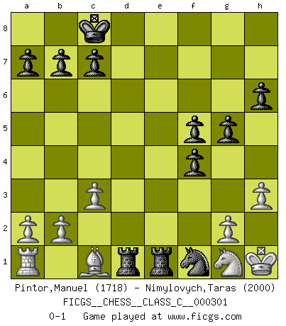 Last move : 0-1 2022 June 10 20:54:35 [Event "FICGS__CHESS__CLASS_C__000301"] [Site "FICGS"] [Date "2022.06.02"] [Round "1"] [White "Pintor,Manuel"] [Black "Nimylovych,Taras"] [Result "0-1"] [WhiteElo "1718"] [BlackElo "2000"] 1.e4 e5 2.f4 exf4 3.Nf3 d6 4.Bc4 h6 5.O-O Nc6 6.d4 g5 7.c3 Bg7 8.Kh1 Nf6 9.e5 dxe5 10.dxe5 Qxd1 11.Rxd1 Ng4 12.Rd5 Be6 13.Rc5 Bxc4 14.Rxc4 O-O-O 15.Nbd2 Ncxe5 16.Nxe5 Bxe5 17.h3 Ne3 18.Re4 Rhe8 19.Nf3 Rd1+ 20.Ng1 f5 21.Rxe5 Rxe5 22.Kh2 Nf1+ 23.Kh1 R5e1 0-1 KGA : Fischer defense Kingside Castling by player White (move 5) Queenside Castling by player Black (move 14) Player Black won this chess game. Follow this game move after move (download)Suddenly it was obvious to me in my analysis I had missed what Fischer had found with the greatest of ease at the board. (Mikhail Botvinnik) Ein Isolani verdüstert die Stimmung auf dem ganzen Schachbrett. (Savielly Grigorievitsch Tartakower) Una clavada es mas poderosa que una espada. (Fred Reinfeld) Tout change constamment, y compris dans le monde des Echecs. (Botvinnik) The weakness of an artist is dogma. (Josh Waitzkin)